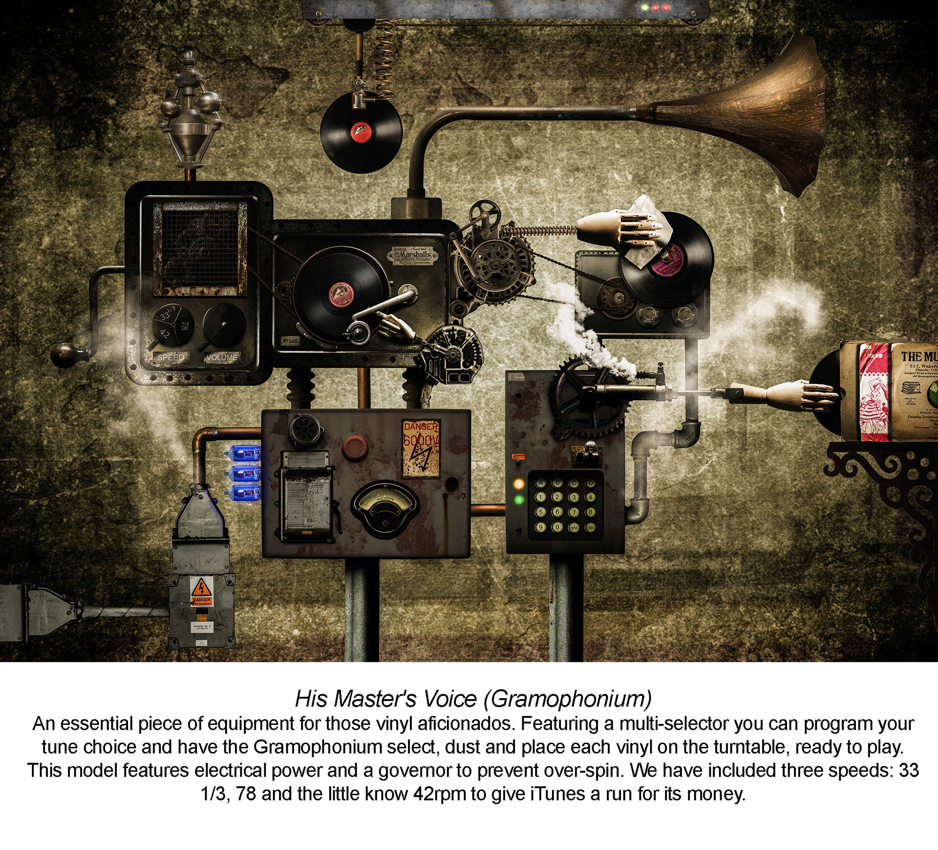 When it's time to 'build' my contraptions I source the various components from my virtual collection. A collection built up over time from visits to curious places, museums, archives and just roaming around. If I find a rusting tool in a forgotten toolbox I see a connecting rod, or maybe I see an old bicycle chain as a conveyor belt.... Copper pipes, cogs, springs and unidentified widgets all play a part in my weird world.